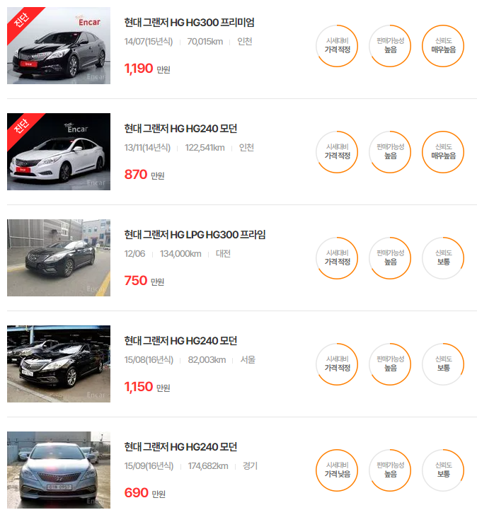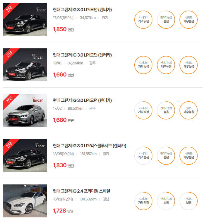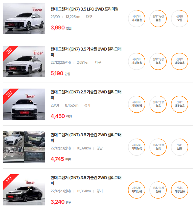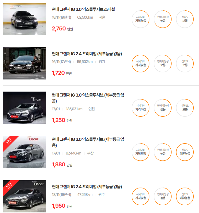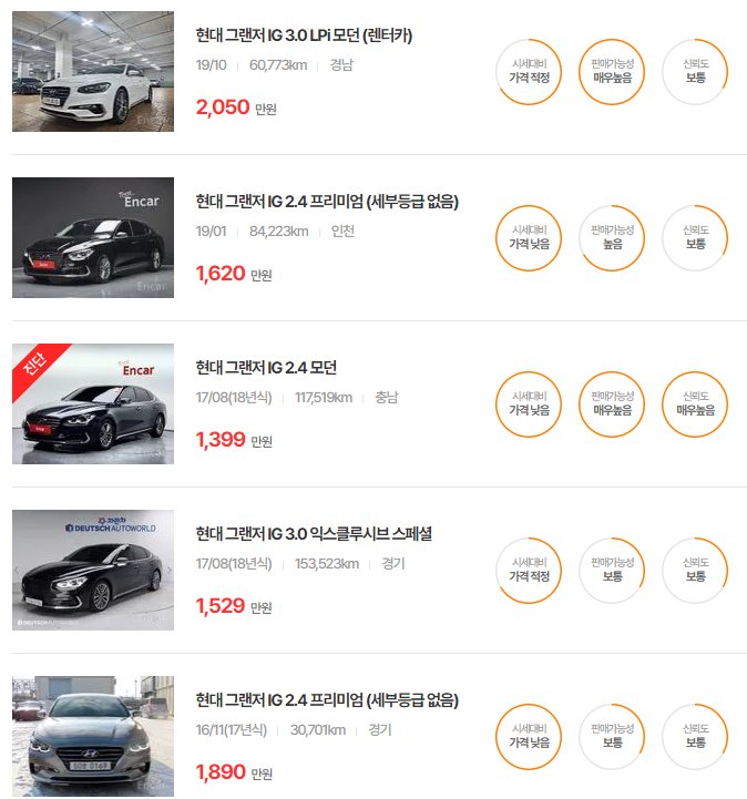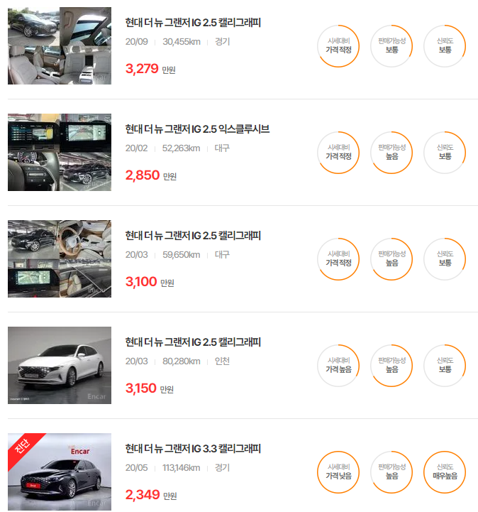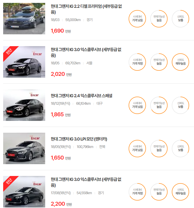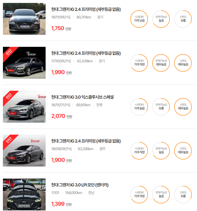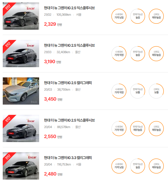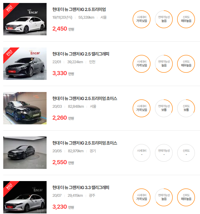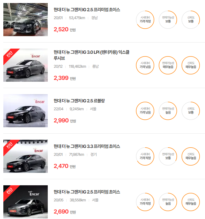 더 뉴 그랜저는 다양한 옵션과 주행거리에 따라 가격이 달라지며, 특히 중고차 시장에서 인기가 높은 연식입니다.
