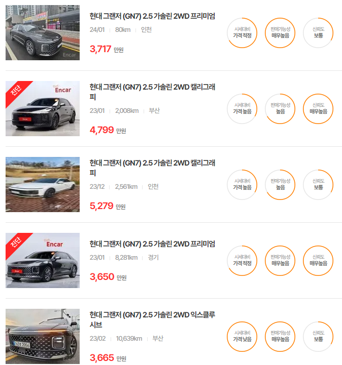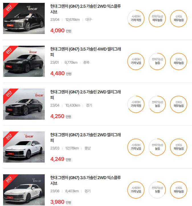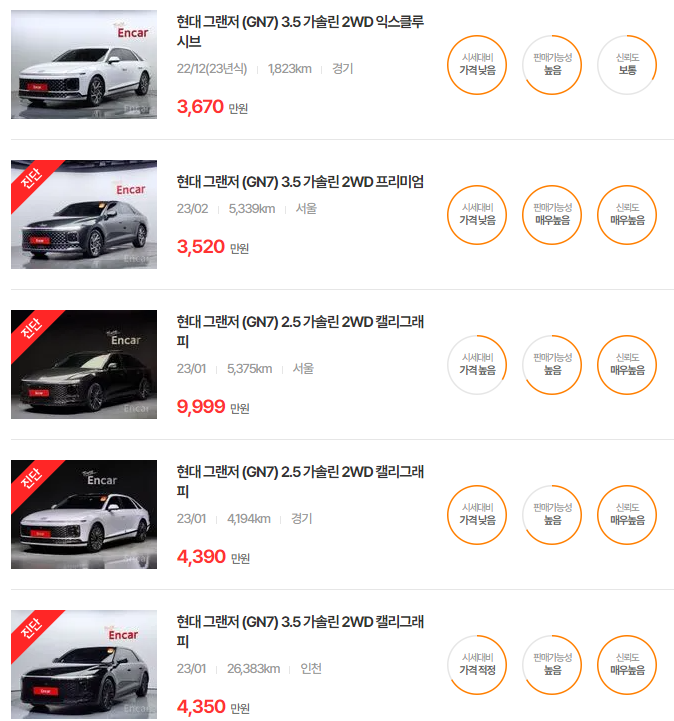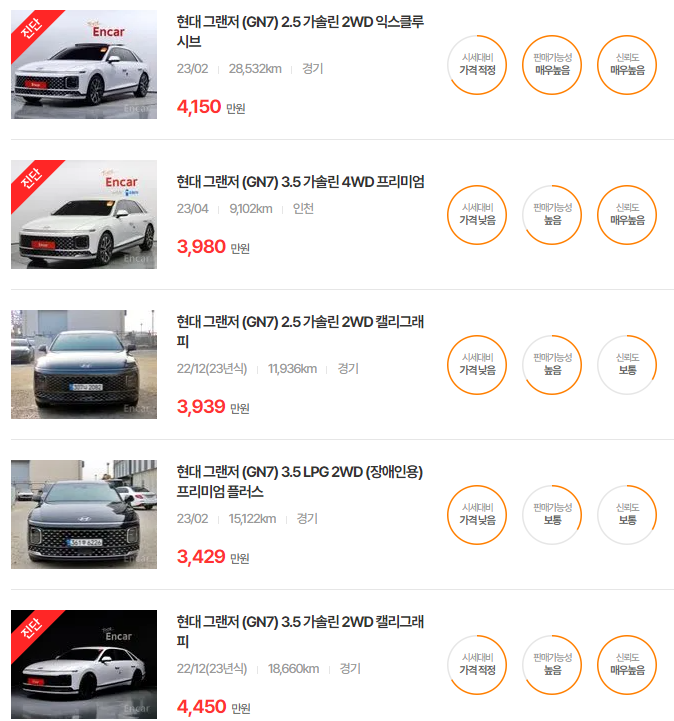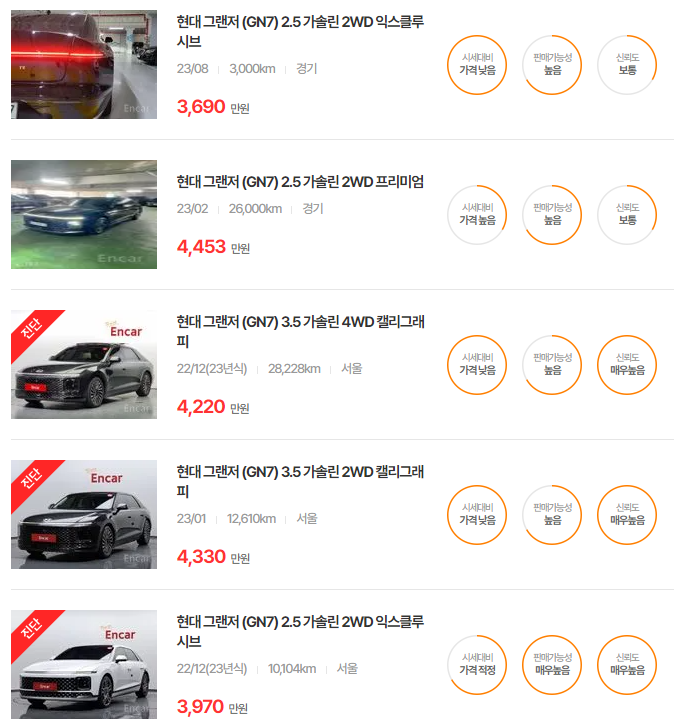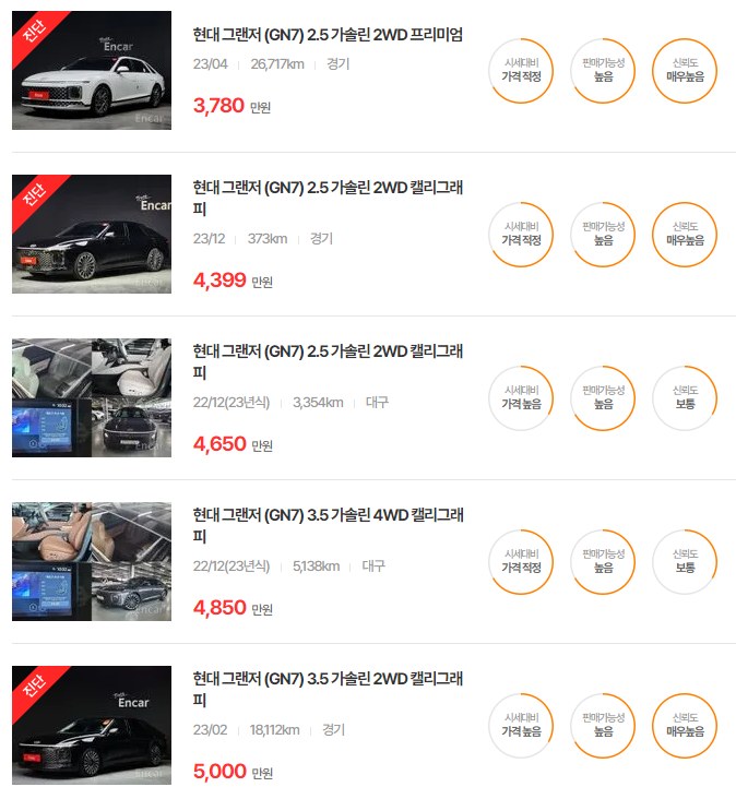 GN7은 최신 연식일수록 고급 옵션과 트림에 따라 가격이 차별화됩니다. 고급 기능이 추가된 트림일수록 높은 가격대를 형성하고 있습니다.