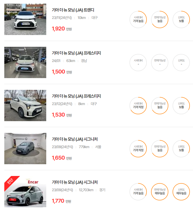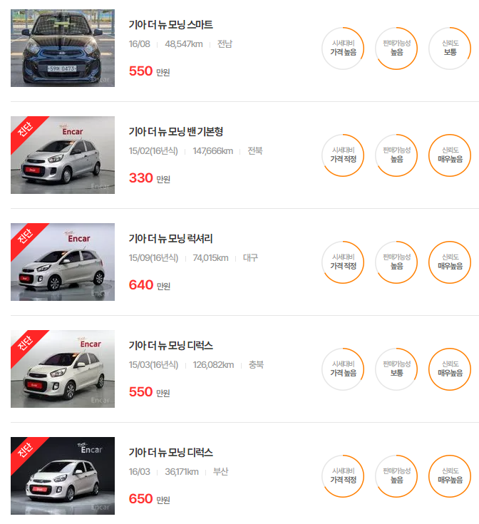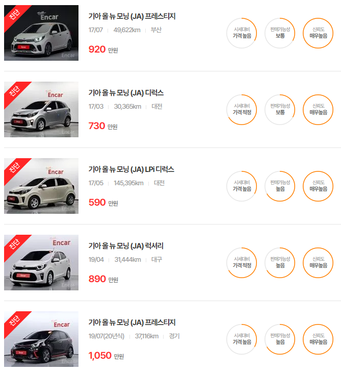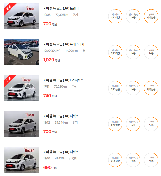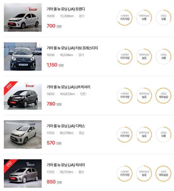 올 뉴 모닝 모델은 가성비가 좋은 연식으로, 상태와 옵션에 따라서 가격대가 다양하게 형성됩니다.