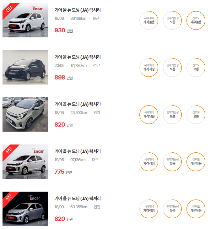 올 뉴 모닝 모델은 가성비가 좋은 연식으로, 상태와 옵션에 따라서 가격대가 다양하게 형성됩니다.