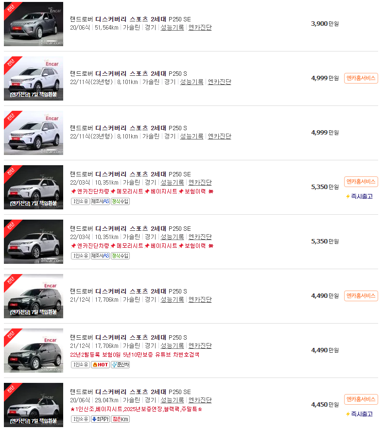 - 엔카는 풍부한 매물과 전문 딜러 네트워크를 통해 다양한 조건의 매물을 제공합니다.