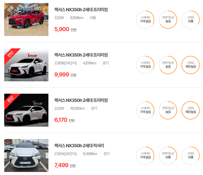렉서스 NX350h 중고차 가격 시세표 | 25년 6월 기준