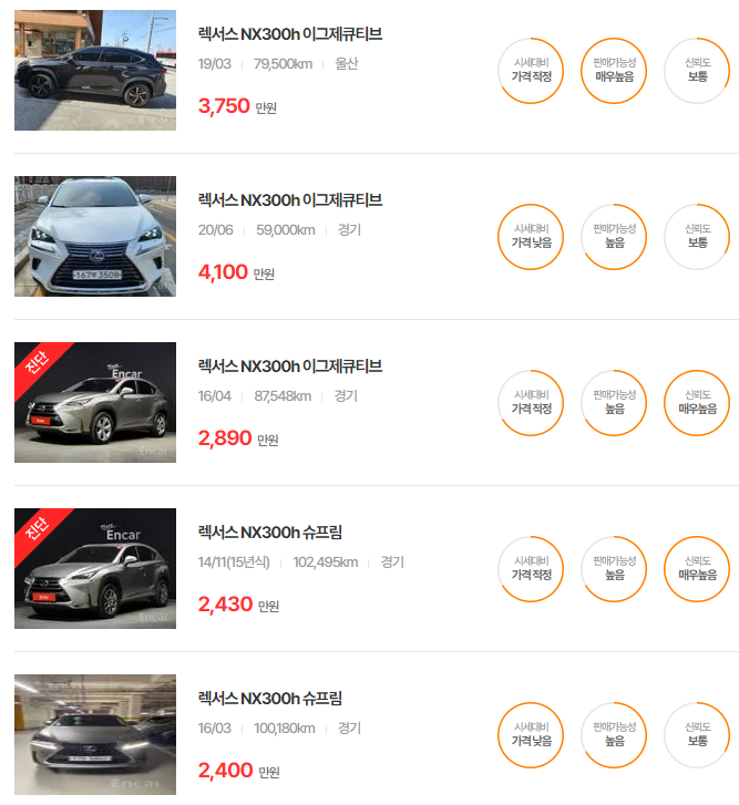 렉서스 NX350h 중고차 가격 시세표