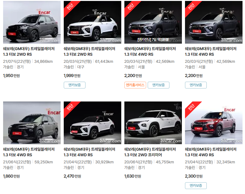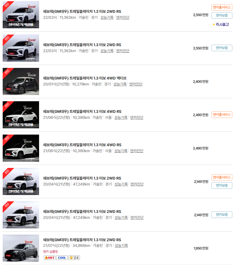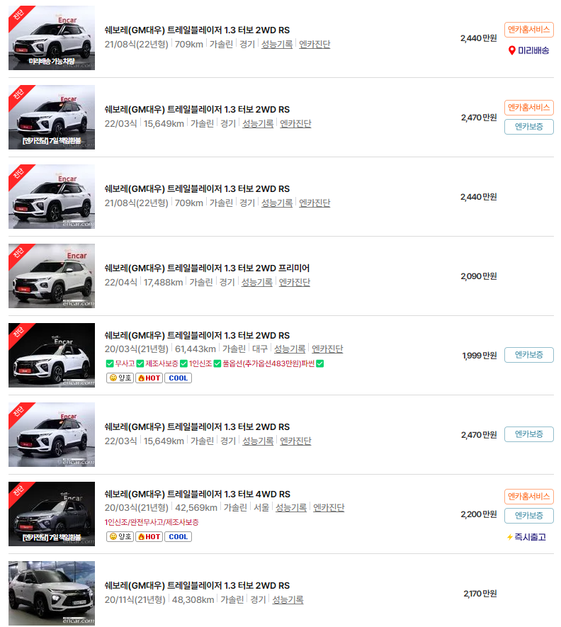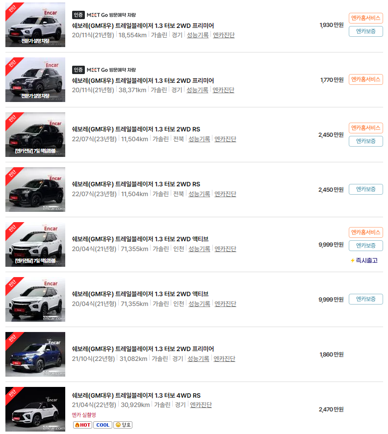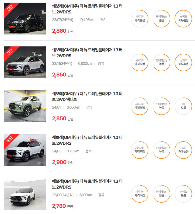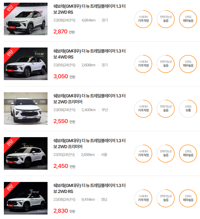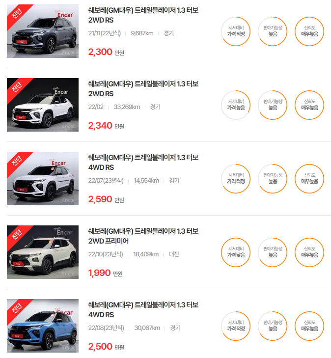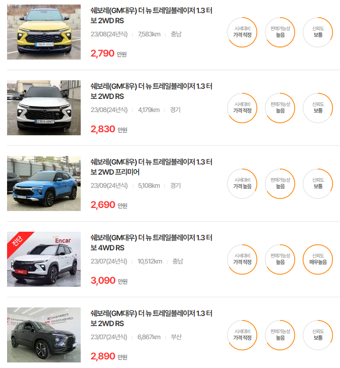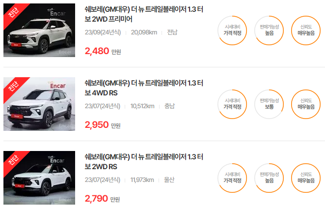 2025년 5월 기준 쉐보레 트레일블레이저의 중고차 가격은 아래와 같습니다.