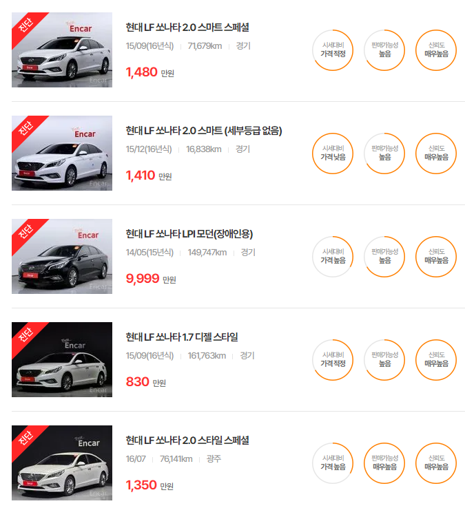 LF 쏘나타는 경제성을 겸비한 모델로, 주행거리 기준으로 손쉬운 선택이 가능합니다.