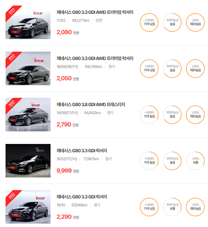 제네시스 G80 중고차 가격 시세표