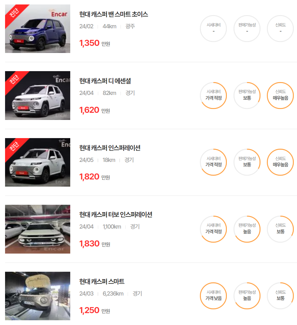 현대 캐스퍼 중고차 가격 시세표 | 25년 6월 기준