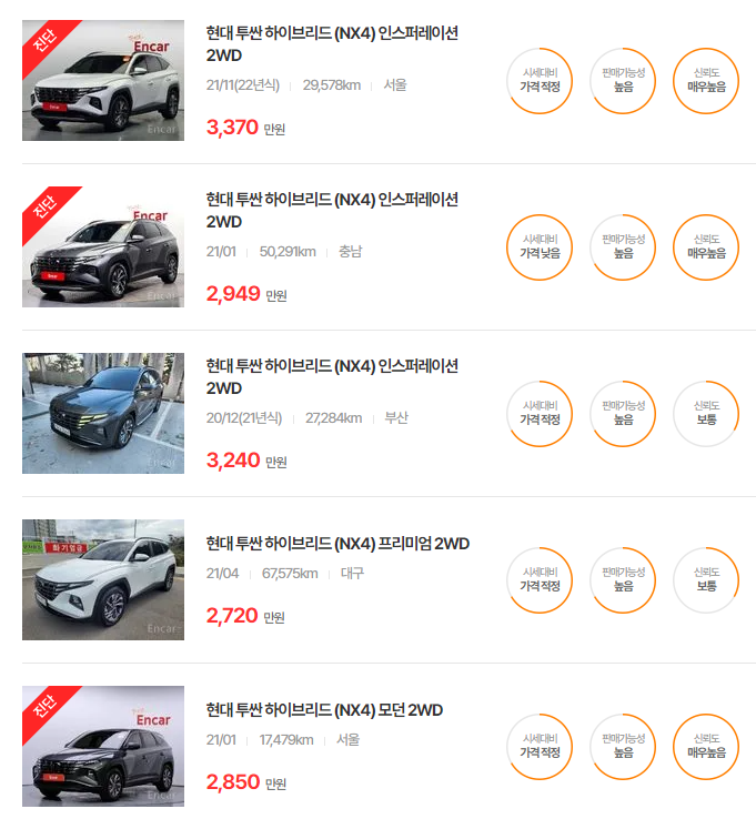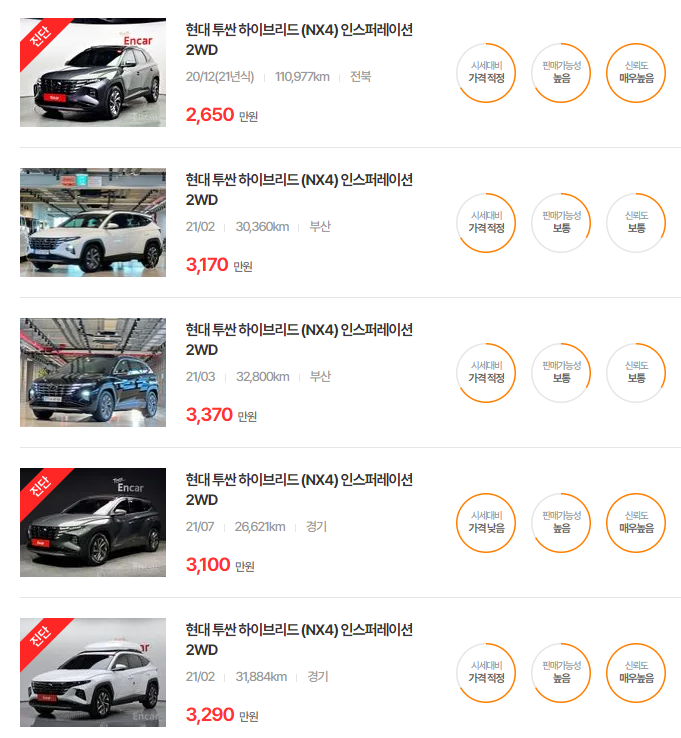 이 시기의 투싼은 합리적인 가격으로 판매되며, 특히 2021년식과 2022년식의 경우 주행거리와 옵션에 따른 차이가 두드러집니다.