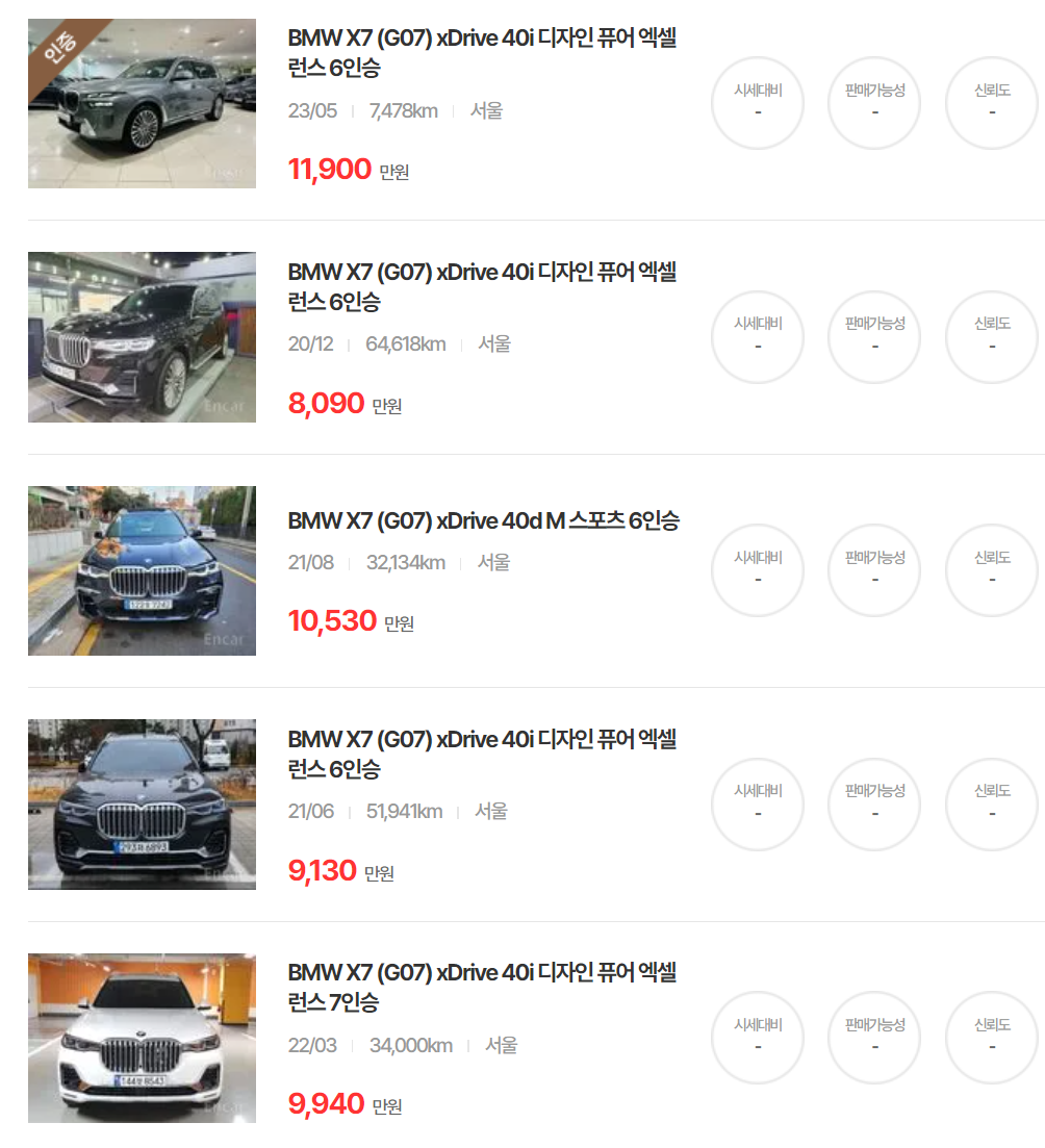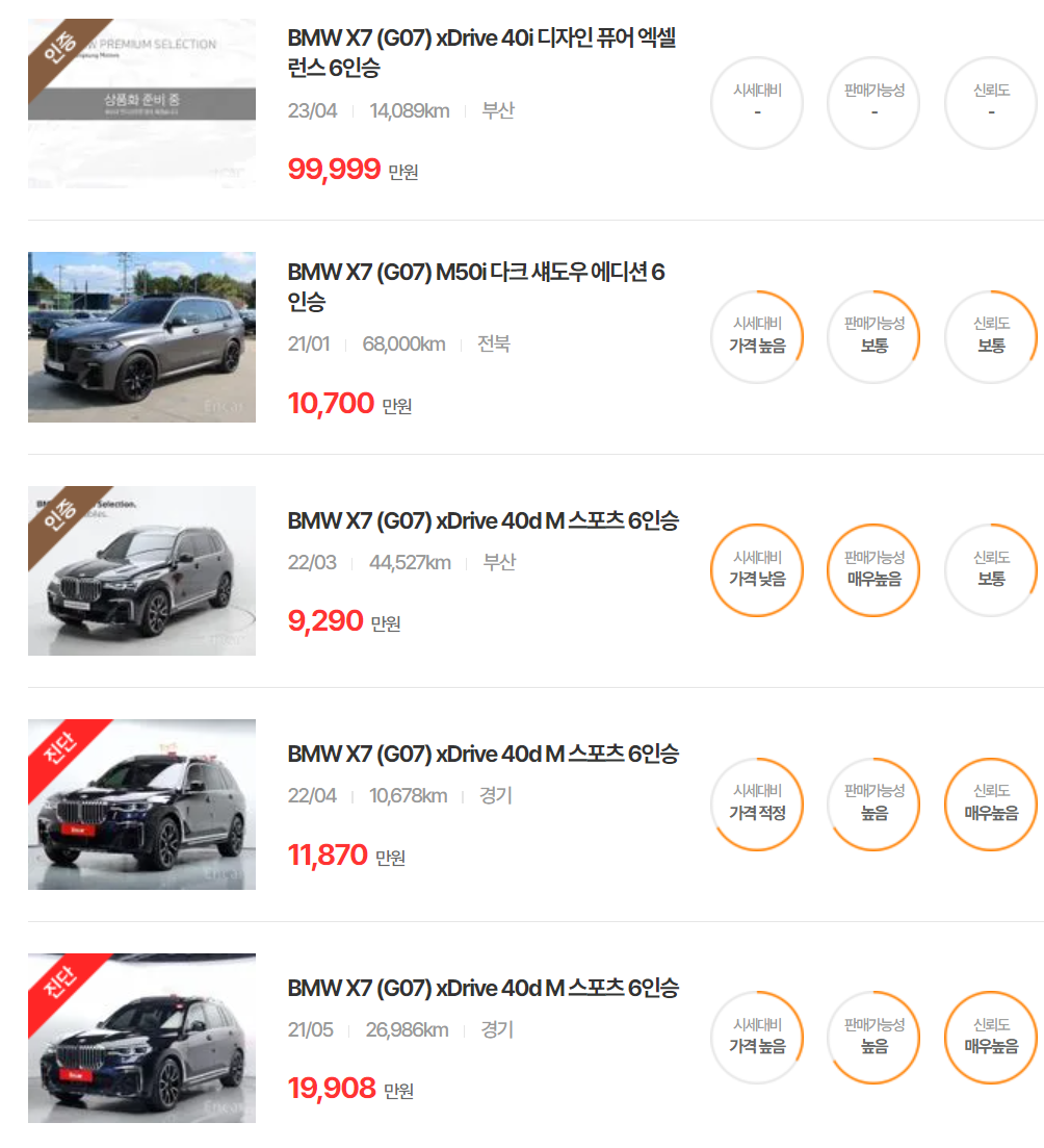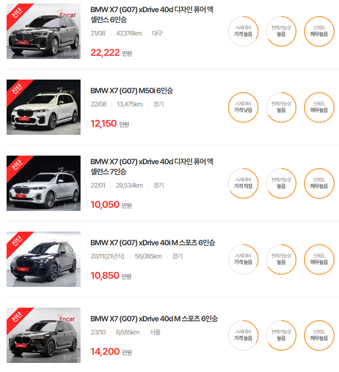 2023년식과 2024년식 BMW X7가 현재 가장 높은 인기를 얻고 있습니다.